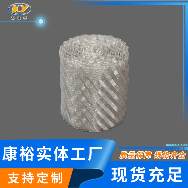 1.jpg  金屬絲網填料是目前世界各國應用比較廣泛的填料,它是由若干平行直列的金屬波紋網片排列組成的圓盤狀填料。它具有比表面積大、孔隙率大、重量輕;氣相通路傾角小、有規(guī)則、壓降低;徑向擴散良好、氣體接觸充分等特點。